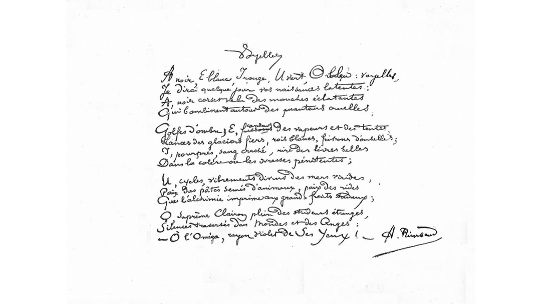 Irudia: Arthur Rimbauden «Voyelles» poemaren eskuizkribua, 1871-1872 ingurukoa. Rimbaud Charleville-Mézières Museoa