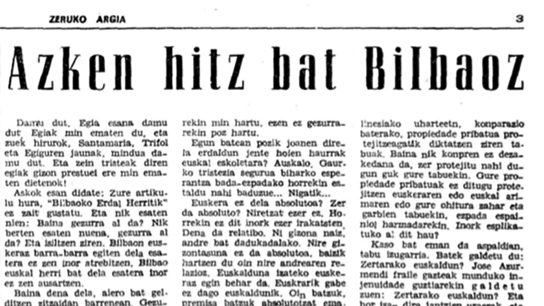 Nire artikulua inori gustatu ez zitzaiola konprenitzen dut, niri ere gustatu ez zitzaidalako. Nik ere hartu nuelako min. Gure egi murritza delako. Baina hobe da egiarekin min hartu, ezen ez gezurrarekin poz hartu. (…) Parada dugunean gure herri artean dauden erdaldun haur guztiak euskaldunduko ditugula, ez gaitezen harritu baldin erdaldunek gure haurrak erdalduntzeko pauso guztiak ematen badituzte. (…) Aitor dezadan nik nire egia. Zororik nagoelako naiz euskalduna, eta gainera zororik egoteko eskubidea dadukadalako. Baina nire zorotasunetik, beste zorotasun horretara, lagun hurkoaren borondatea bortxatzeko zorotasun horretara, alde haundia dago.