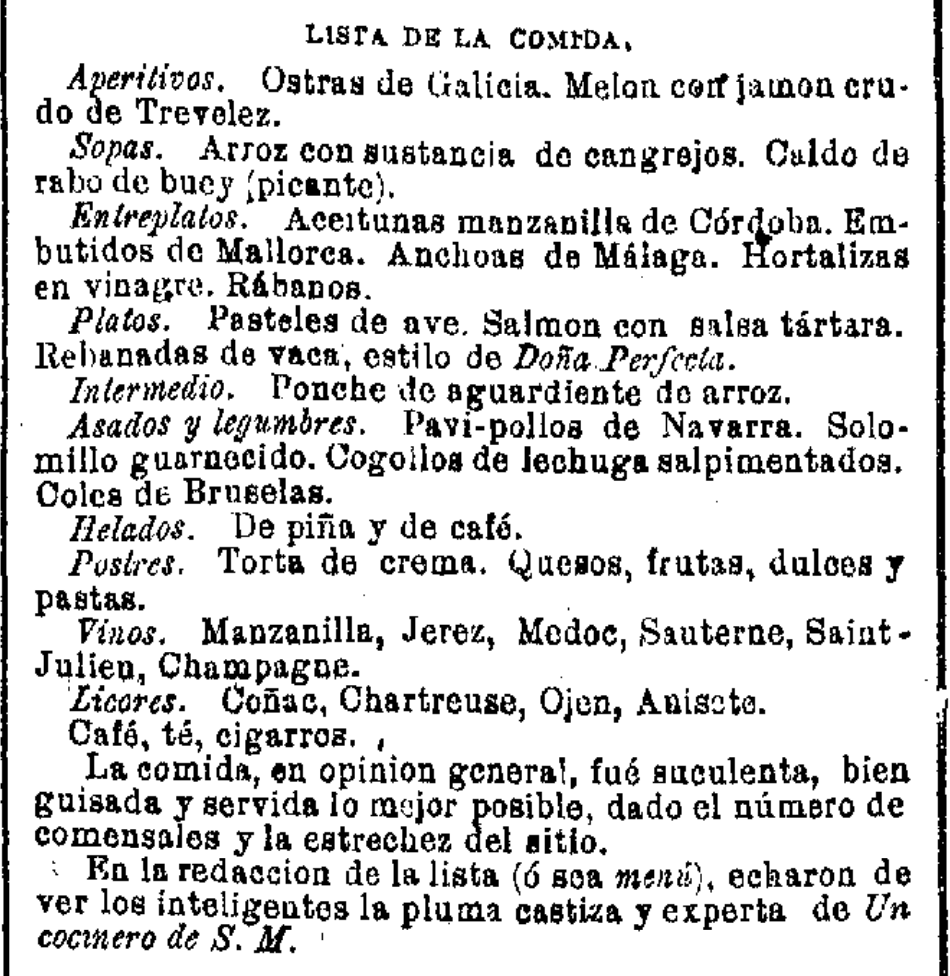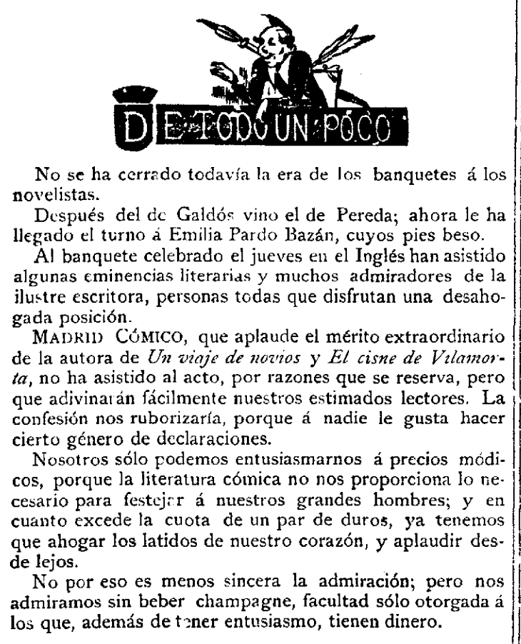 Bota nahi beste lore Castrori eta Serranori ere (gera dadila geure artean), haiei zor diegu Canovasen agerpena; laudatu itzazu asko militarrak, medikuak, artistak, uholdean etorri ziren denak, talde ezin bikainagoak —laudatu Echegaray ere, miragarri egon zen, handi eta apal. Tira, lauda itzazu guztiak. Ez erasotu Akademia, ezta aipatu ere. Hobe da isiltasuna. Eman bostekoa eta milioi bat esker hiri loriatsu horretan ezin gehiago maite zaituen Benito Perez Galdosekin akordatu diren guztiei.