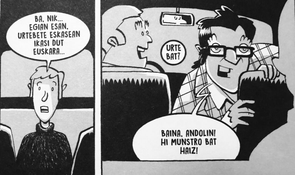 Hain itxuroso eta korrontoso euskeraz mintzatzen bakarrik urte-betean ikasi zuela esan zeukunean, bioi atera zitzaikun, arimaren zolatik aldarri sentitu hau: «Baina, hi munstro bat haiz!».