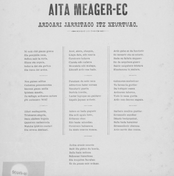 «Aita Meager-ec ardoari jarritaco itz neurtuac», data ezezaguna, 1860ko hamarkada