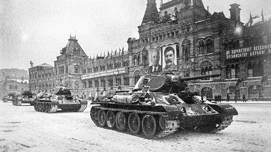 Stalinek, uniformez, eskua bere kapelaren biseratik jaitsi eta bere autora igo zen berriro. Karabanak zirkulu zabal bat egin zuen, eta Kremlinera itzuli zen, milaka lagunen begiradapean. Orduan beren begiekin Stalin geratu egiten zela ikusi zuten, eta Mosku entregatuko ez zela ulertu zuten.
