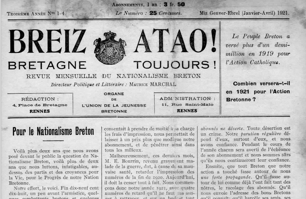 1918an, Morvan Marchalek, hainbat lagunekin batera, Talde Erregionalista Bretoia sortu zuen, bere helbudura, estatutuen arabera, «aberri bretoiaren altxatzea» zuela. Urtebete geroago, 1919ko urtarrilean, Breiz Atao hilabetekaria martxan jarri zuen, hasiera batean «erregionalismoa eta autonomia administratiboaren» aldekoa zena. Aldizkaria berehala Eliza katolikoaren jopuntu bihurtu zen, bere ustezko neutraltasun erlijiosoagatik. Hala, erakunde erlijioso horrrekin tentsio betean, 1924an, Marchalek berak katolikoek egiten zuten mugimendu bretoiaren «monopolizazio saiakeraren» kontra idatzi zuen.