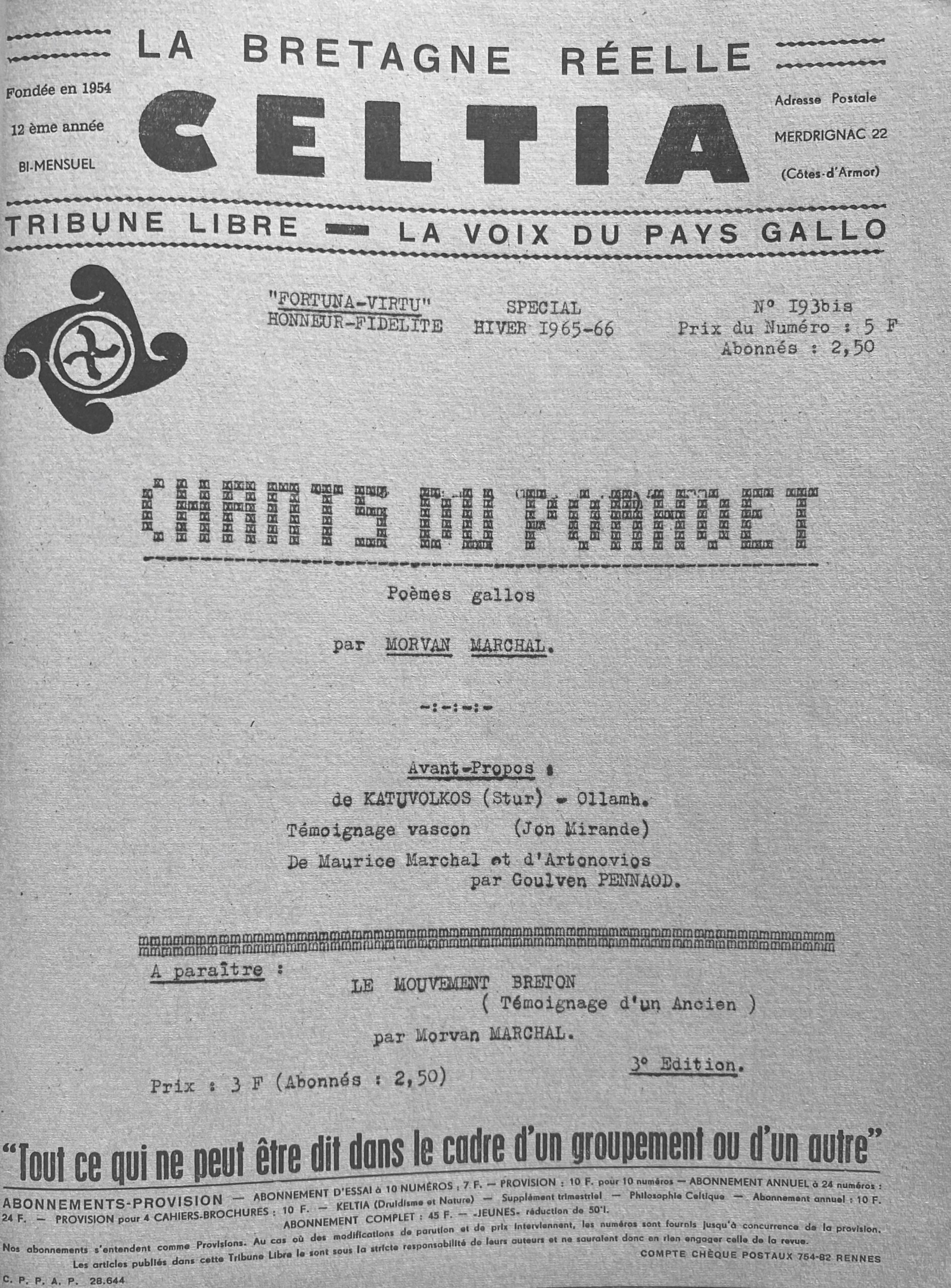 Morvan Marchal; Chants du porhoet: Poèmes Gallos, La Bretagne Réllee, 1965, ale berezia