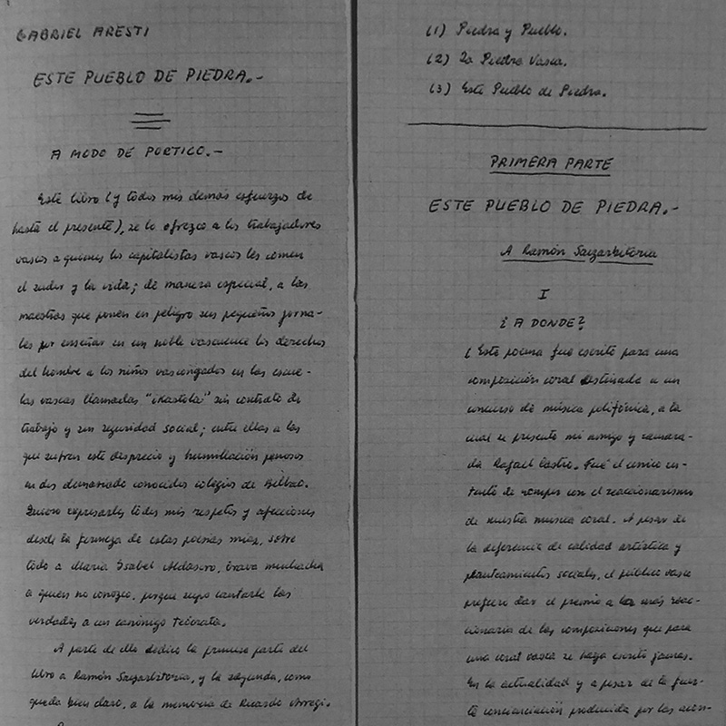 Ramon Saizarbitoria lagunari eskainia dagoen Harrizko herri hau liburuaren eskuizkribua. Aresti-Esteban sendiaren funtsa, Jon Kortazarren El poeta Gabriel Aresti liburutik hartua