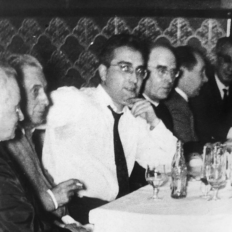 Gabriel Aresti Euskaltzaindiako kideekin Bilboko alde zaharreko Txoko Eder tabernan 1963ko urrian. Argazkia Euskaltzaindia